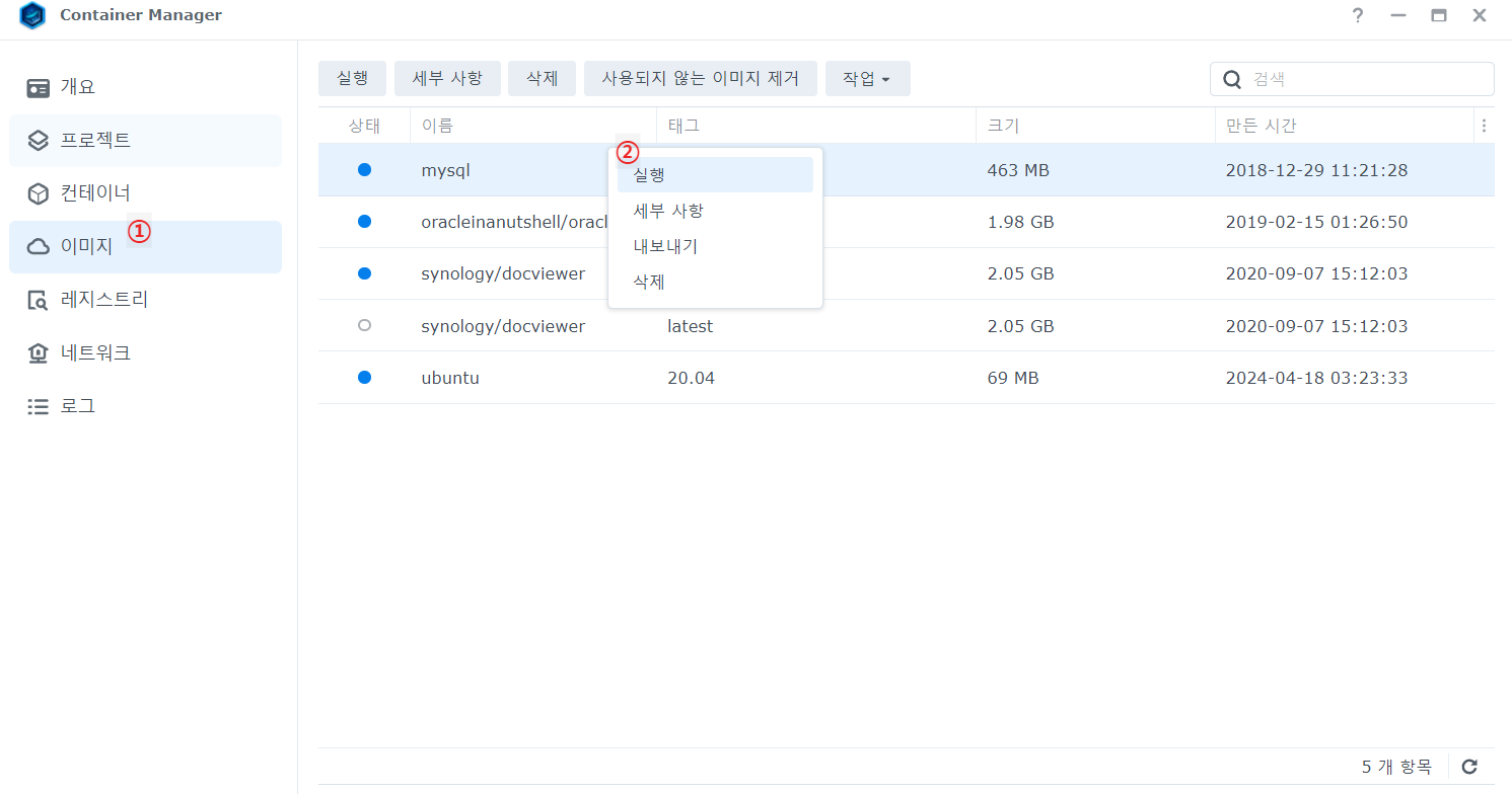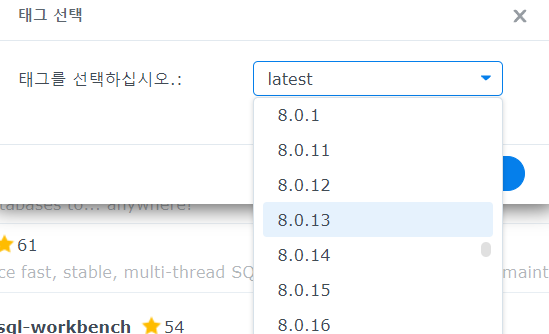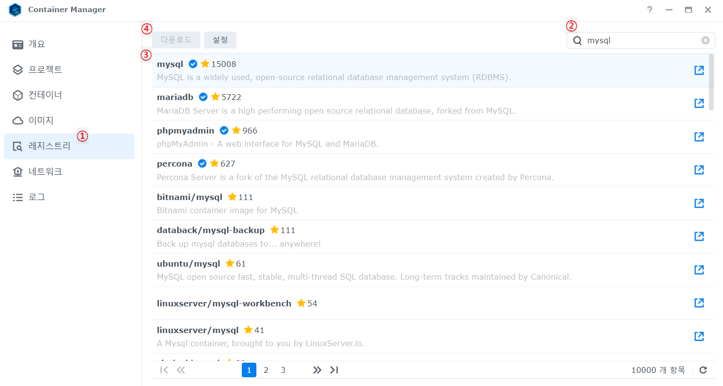 Docker(Container Manager) 레지스트리에서 mysql 검색 후 별이 가장 많은 것을 선택 후 다운로드