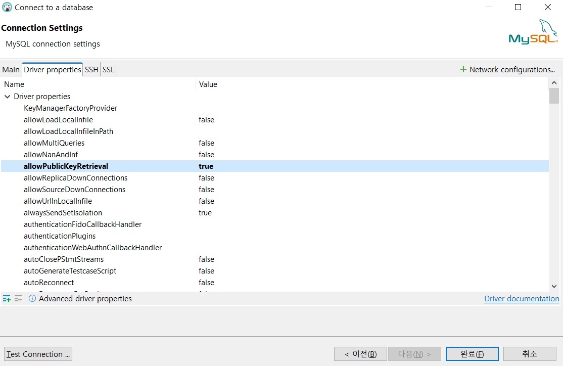 혹시라도 allowPublicKeyRetrieval 오류가 뜨면 아래 더보기를 클릭해보자