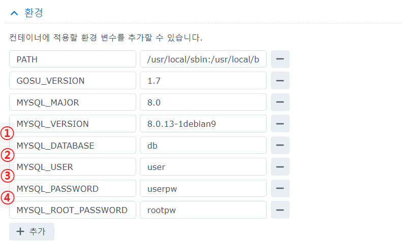 ⑤ MYSQL_ROOT_PASSWORD 변수에 입력했던 값 입력