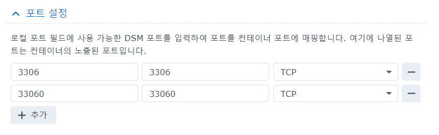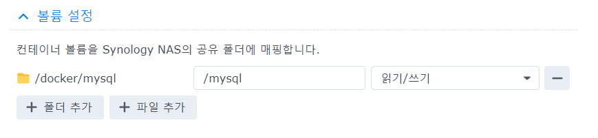 Docker 디렉토리에 mysql 폴더를 생성해주고 선택 해 준 다음 /mysql 맵핑 해줬다