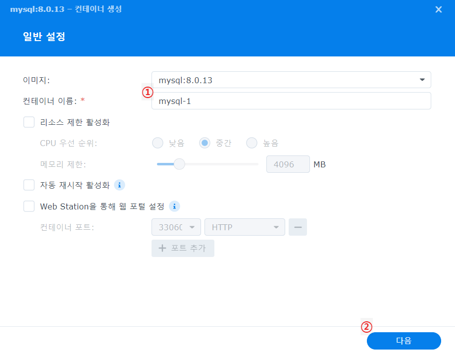 실행을 누르면 세팅을 하라고 나오는데 크게 건드릴 것 없이 컨테이너 이름만 따로 세팅하고 다음 눌렀다