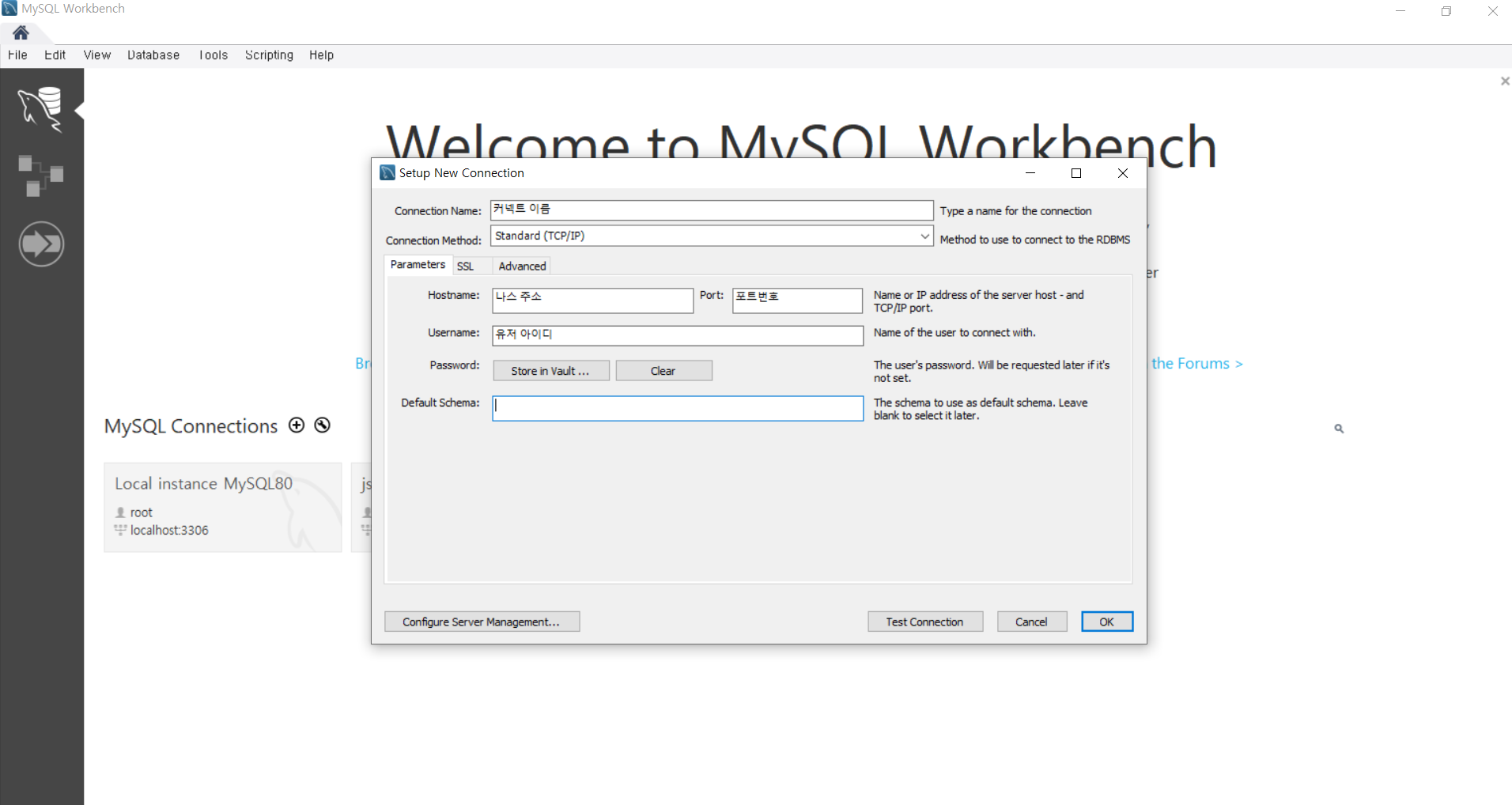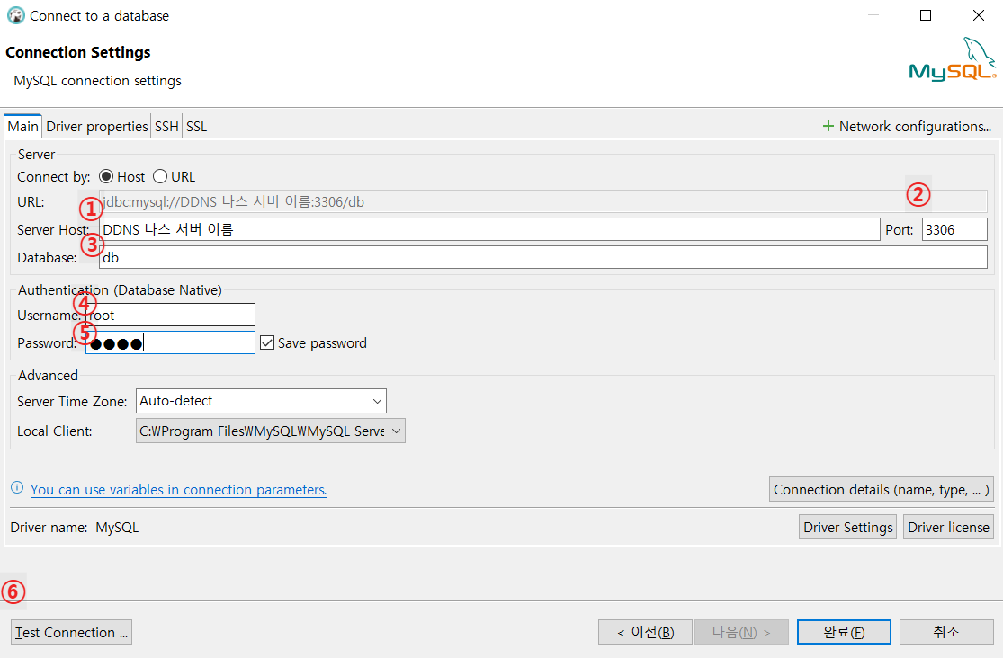 포맷에 맞춰서 입력하고 test Connection 클릭