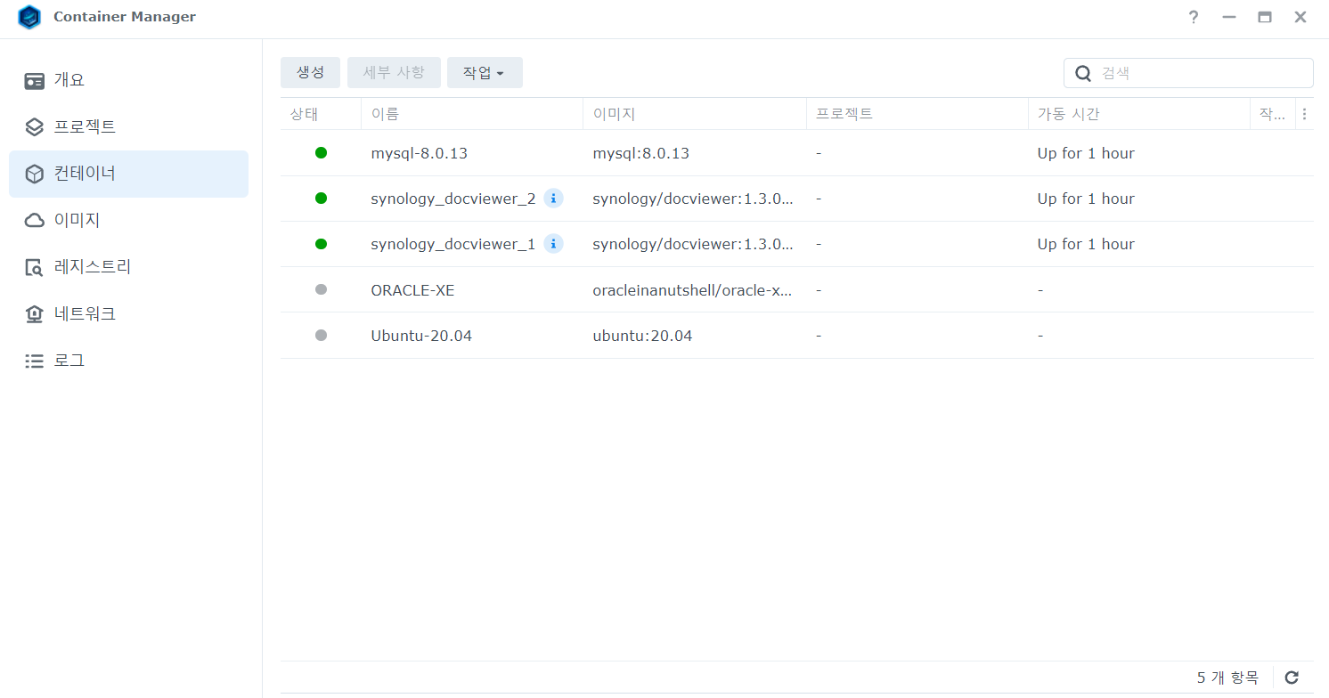 1. docker 설치 패키지 센터에서 docker 설치 2. docker에서 mysql 설치 docker에서 레지스트리 탭 선택 후 mysql 검색. 더블클릭해서 원하는 버젼 선택 후 설치. 나는 latest 하니까 알수없는 이유로 실행이 안