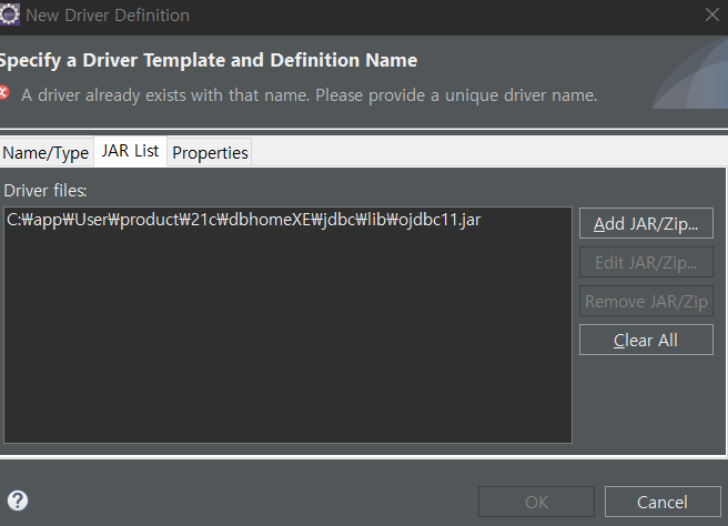 clear all 을 클릭 후 add jar을 클릭하여 jdbc를 추가한다
