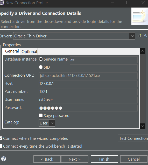 필자는 오라클을 공부하고 있어서 xe버전을 사용중이라 이렇게 만들었다 다 완성하고 test Connection을 클릭하면 결과가 나올것이다 정상적으로 ping succeeded 가 나오면 finish를 클릭하여 마친다