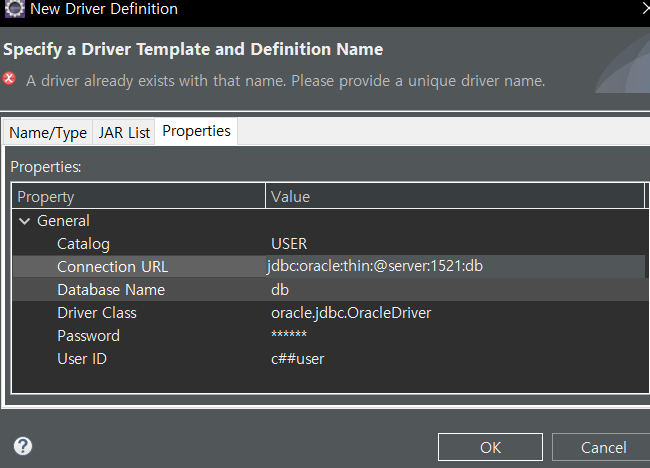 자신의 데이터베이스 정보를 입력하고 ok를 클릭한다